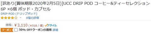 Amazonにて「UCC DRIP POD コーヒー&ティーセレクション 6P ×6個 ポッド・カプセル」が賞味期限2020年2月5日のため半額クーポンが出ています。商品ページはこちら:https://amzn.to/36TXsdL
