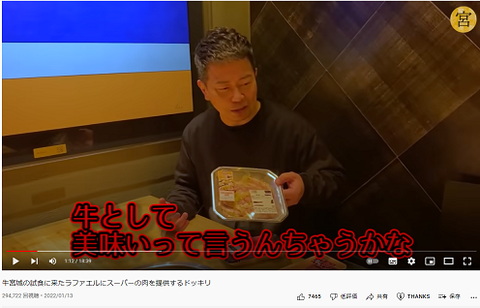 宮迫は13日にタイトル「牛宮城の試食に来たラファエルにスーパーの肉を提供するドッキリ」で動画を更新。ラファエルは「牛宮城」支援を打ち出していて、コラボ動画の撮影に来店したラファエルに対して「牛宮城のお肉が完成しました。1番最初の試食です」とスーパーで適当に買ってきた安い肉をきれいに盛り付けし、試食させた。