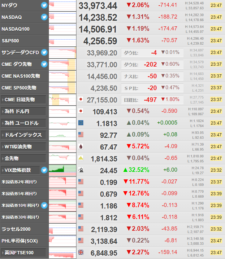 ダウは700ドル超下落、原油は68ドル台を素通りして67ドル台へ。