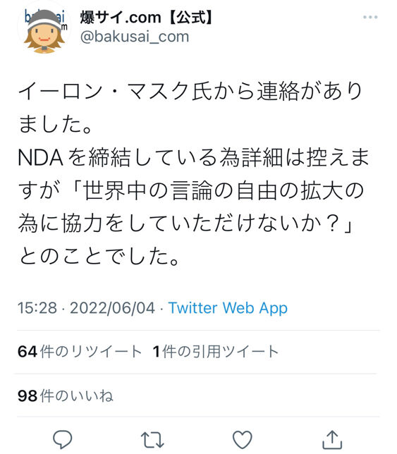 【速報】爆サイ、イーロンマスクから接触!!