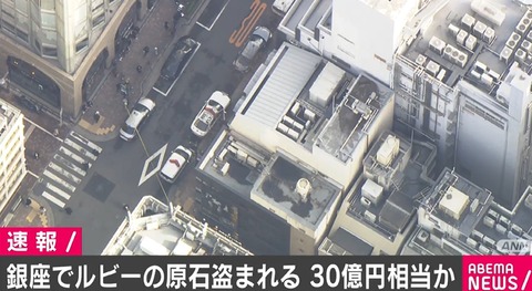 正午ごろ、東京・銀座のビルでルビーの原石が男らに盗まれた。当時、ビルでは4人ほどで商談が行われていて複数の男が宝石を持って逃走したということだ。