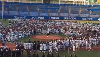 そして、戸惑っている稲村を囲う円が徐々に小さく……最後は中学生がなだれ込んでもみくちゃ状態、稲村もどこにいるのかわからない状態になってしまった。アナウンスの「選手は元の位置にお戻りください」の声もむなしく響くのみ、まさに無法地帯と化してしまった。