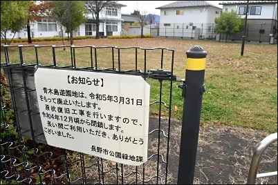 ふとフェンスの張り紙を見ると「青木島遊園地は、令和5年3月31日をもって廃止いたします」とあった。市役所が作った張り紙だ。原状復旧工事のため今月ごろから閉鎖するとし「長い間ご利用いただき、ありがとうございました」と結んでいた。