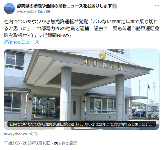 掛川市内で複数回にわたって無免許運転をしたとして、中部電力パワーグリッドの社員が逮捕されました