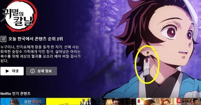 27日、様々なオンライン コミュニティに「ネットフリックスのメインにどかんと登場した旭日旗」というタイトルの文が多数登場した。該当写真は日本の人気アニメ「鬼滅の刃」ページの代表イメージ。