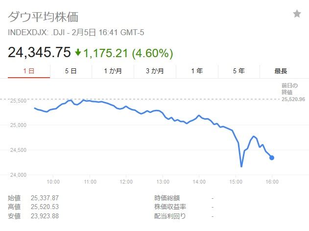 週明け5日のニューヨーク株式市場は、アメリカの長期金利の上昇をきっかけに株価が急落した流れが続き、ダウ平均株価は、一時、取り引き時間中としては過去最大の1500ドル以上の値下がりとなり、終値でも1100ドル以上値下がりし、過去最大の下げ幅となりました。