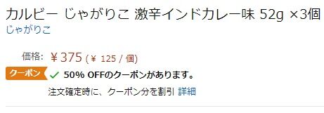 Amazonパントリーにて「カルビー じゃがりこ 激辛インドカレー味 52g ×3個」に50%OFFクーポンが登場!1個当たり約63円の激安価格に!辛いもの好きな人は是非この機会にどうぞ!(クーポンの表示がなくなっていたら終了です。値段変動がある可能性がありますので必ずご確認下さい。)