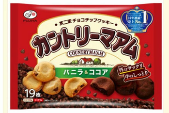 まずは、株式会社不二家の『カントリーマアム』。いくつもの商品がある中、バニラ味とココア味が入っているお徳用の大袋タイプは‘92年の発売当初は28枚入りで1枚当たり11.5グラムだった。