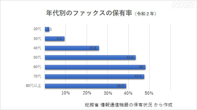 「どうして超ハイテクな日本人がFAXに執着するんだい?」東京オリンピックをきっかけに、応援メッセージを受け付けるFAX番号を見たり知ったりした海外の人たちからこんな声がネット上にあがっています。「日本は2021年になってもFAXを使っているの!?」といった投稿も。そこで日本のFAX事情を調べてみました。世界中にバレてしまったか!ネット上に投稿が目立って来たのはオリンピックが開会した先月下旬ごろから。「私の国は日本ほど発展していないかもしれない、でもFAXを使うことはないですよ」といった投稿もあり、日本からも「ヤバい!世界中にバレてしまったか!」といった投稿がありました。確かに日本ではテレビや自治体が選手への応援メッセージを募集する際、受け付けの投稿フォームやメールアドレスだけでなくFAX番号を紹介することが多いのです。世界にネット網が広がる中、海外の人からは主に電話回線を使うFAXは時代遅れのように見えるのかもしれません。まだまだ人気FAXってどれくらいの人が持っているのか、調べてみると私としては驚きの数字が出てきました。総務省が令和2年に行った「情報通信機器の保有状況」の調査結果です。FAXがある人は20代は2.1%と50人に1人、30代でも9.4%と10人に1人ほどです。ところが40代になると4人に1人(25.8%)になり50代から70代は40%をこえています。80代以上でも40%近く(38.9%)の人がFAXを持っています。FAXは日本ではめちゃめちゃ現役なのです。