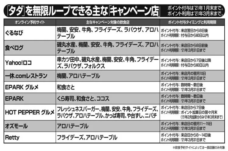 「ランチで入った店でたまたま隣に座ったカップルが『アレを使ったから、今日はほとんどタダだよ』とうれしそうに話していました。その店はキャンペーンの対象店だったみたいです。相当お得なので、自分もチェックしておけばよかったと後悔しました」そう嘆くのは、都内の30代サラリーマン。利用するのとしないのでは大違い。明暗がくっきり分かれるのが、飲食店や農林漁業者を応援するために10月1日から始まった「Go To Eat(イート)」キャンペーンだ。まずは基本を押さえよう。「キャンペーンには2種類の利用方法があります」とはジャーナリストの田中圭太郎さん。「1つが食べログやぐるなびなどオンライン予約サイトを利用する方法。13社15サイトが参加しており、対象店で利用できます。1回の予約につきランチタイム500ポイント(全サイトで1ポイント=1円)、午後3時以降のディナータイムは1000ポイントが付与され、次回、同じ予約サイトを経由して飲食店を利用する際に活用できます」もう1つの方法が、「プレミアム付食事券」だ。「購入額に25%の上乗せがつく食事券です。例えば1万2500円分の食事券を1万円で購入できます。販売方法や窓口は自治体ごとに異なるため、農林水産省の公式サイトで確認してください」(田中さん)なかでも、オンライン予約は数々の裏技が指摘される。“令和の錬金術”として世を驚かせたのは、居酒屋チェーン「鳥貴族」のケースだ。節約アドバイザーの丸山晴美さんが解説する。「サイトで席だけ予約して1000ポイントをゲットし、店舗では1000円以下の商品を注文して、ポイントとの差額分を上限なく貯め続ける方法です。そのやり方が話題になると、鳥貴族は席のみの予約などをキャンペーンの対象外にしました」一方で、現在も合法的に利用できるのが“無限くら寿司”と呼ばれる方法だ。「回転寿司チェーン『無添くら寿司』を予約サイト『EPARK』で予約して食事すると、1人1000ポイントが付与されます。次回、1000円以内で食事すれば、前回分のポイントだけで会計が足ります。以降、同じことを繰り返せば、ポイントだけで無限に寿司を食べ続けることができます。鳥貴族は300円ほどのメニューだけ頼んでポイントを荒稼ぎすることが問題視されましたが、くら寿司は1回の食事につき、1人1000円の最低利用料金をクリアすれば誰でも利用できる。まさに政府とお店の“公認”の裏技です」(丸山さん)さて、ここからが本題。「無限にタダ」ができるのはくら寿司だけではない。付与ポイント以上(ランチ500円、ディナー1000円)の飲食を行えばポイントが付与されるため、1人1000円(ランチは500円)のメニューがあるキャンペーン対象の飲食店では最初の利用時のみお金を払えば、以降は付与されたポイントで支払い続けることが可能になるのだ。「ただし、くら寿司は『2名以上の予約』が必要です。くら寿司のように人数制限や最低利用料金を課す店舗もあるので、“おひとりさま”は要注意です」(田中さん)かっぱ寿司、牛角、磯丸水産、ココスなども「無限タダ」が可能だ。対象店の一部を、オンライン予約サービス別に別掲表にまとめたので、参考にしてほしい。ポイント付与のタイミングとポイント利用期間にも注意したい。