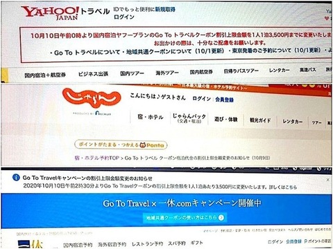 旅行予約サイトを通じたGoToトラベルの利用について、週末に各業者が割引金額の上限引き下げや割引終了を発表し、利用者からは戸惑いの声も上がっている。こうした状況に、街からは、戸惑いや憤りの声が聞こえた。群馬から観光に来た姉妹「知らなかったです。今の話は初めて聞いたので、びっくりした」、「サイトによって何なんですかね。上限決められていたんですかね、初めて出てきた話。これからGoToトラベル使えるところを利用したいと思うよね」女性「ちょっとした不公平感。GoToトラベル予約して半額ぐらいになったのを、いったんキャンセルしちゃった。それで、もう1回取り直そうとしたら、今度は割引率が急に少なくなっていて、あの時キャンセルしなければ良かったなと思っているところ」2020年10月12日 月曜 午前11:49■他ソースGoTo割引に「異変」?1万4000円→3500円に引き下げたYahoo!トラベル・じゃらん・一休、楽天トラベルは回数制限