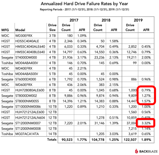 クラウドストレージサービスを提供するBackblazeが、自社のデータセンターで使用しているHDDの故障率をまとめたデータの2019年版を公開しました。12万台を超えるHDDのデータがメーカーおよびデータ容量別に整理されており、どのモデルの故障率が高い傾向にあるのかがよくわかります。2019年末にBackblazeのデータ用ストレージとして稼働していたHDDは12万2658台。そこからテスト目的で使われていたHDDや、稼働日数の総計が5000日未満で、統計的に有意な台数とは言えないモデルを除いた12万2507台のHDDからデータを収集した結果は以下の通りです。全HDDの2019年における年間故障率(AFR)は平均1.89%と、2018年の1.25%から0.74ポイント悪化。2019年に故障が一度もなかった4TBのHDDは、稼働台数が99台と少ない東芝製のモデル(MD04ABA400V)のみでした。