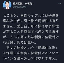 発信したのは、荒川区の小坂英二区議(49)=5期目。同区が4月から同性パートナーシップ制度の導入を予定していることに反対しており、1月13日に「男女の結婚という『標準的な形』を保護し法制度に位置付けるというラインを踏み外してはなりません」ともツイートしている。