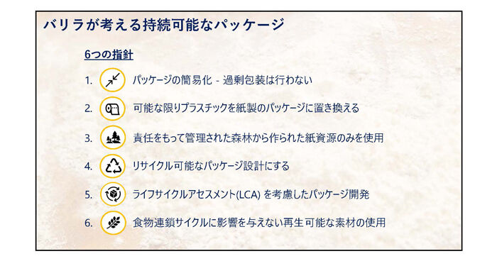 スーパーで見かけるパスタの青い袋が、今後は紙製の青い箱になる。バリラジャパンは15日、国内で消費者向けに販売されるパスタ製品のパッケージを、2021年春から認証取得済みの紙製の箱に切り替えることを発表した。新紙パッケージは「ブルーボックス」と呼ばれ、同社のサステナビリティの象徴として世界各国のバリラ製品で既に使用されているという。国内でも脱プラスチックの機運が高まっていることを受けて導入に踏み切った。同社のニックヒル・グプテ代表はイベントで「プラパッケージ卒業」を宣言。女優・創作アーティストの のんさんも出席し、SDGsの推進を啓発した。(サステナブル・ブランド ジャパン編集局)(中略)日本人一人あたりのプラスチックごみ排出量は年間約32キログラムと言われる。バリラジャパンの今回の素材切り替えでは年間31トン、968人分相当のプラスチックごみ排出量を削減できるという。「ブルーボックス」と呼ばれる新パッケージにはのぞき窓がデザインされており、この部分のみプラスチック素材が使われるが、今後リサイクル可能な素材に変更するなど対応する予定(2019年の同社製品パッケージの99.7%はリサイクル可能に設計されているという)。また食品の安全を考慮し、リサイクル紙を使わず、FSC認証やPEFC認証を取得したバージンパルプ100%でつくられる。実際に手にしてみると、立てたり積み重ねて置くことが容易で、利便性も上々。一度開封した箱を密閉するには専用のキャップが必要だが、保存性能についても従来のプラの袋と同程度だという。15日に行われた「バリラ 新紙パッケージお披露目 PRイベント」ではグプテ代表がプラパッケージ卒業を宣言し、同社の持続可能性に関する考えが発表された。その中で示された持続可能なパッケージについての6つの指針は以下の通りだ。サステナビリティとSDGs推進する姿勢強調企業ミッションに「Good for You, Good for the Planet(GYGP)あなたに良いもの、それは地球にも良いもの」を掲げる同社は、「我が子に食べさせたいと思える食品を人々に提供せよ」という創業者のピエトロ・バリラ氏の思いを受け継いでいる。グプテ代表はプラごみ削減だけでなく「バリラグループとしてはCO2排出量を削減すること、水の使用量を削減することを重要な課題だと考えている」と話す。実際、原料の小麦粉の輸送手段としてトラックなどを使わず、自社で輸送用のレールを設置し専用の列車を運行するといったCO2削減への投資、取り組みを行っている地域もあるという。また、同社は取引のある約9000の農家に持続可能な農業のノウハウを共有したり、使用すべきではない薬品の情報共有、製品だけでなく土壌そのものを持続可能にするための情報の共有などのコミュニケーションを行っている。グプテ代表は広くサステナビリティとSDGs達成への取り組みを推進する姿勢を示した。