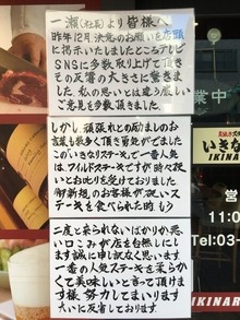 この「いきなりステーキ」で一番人気は、ワイルドステーキですが、時々硬いとお叱りを受けておりました。御新規のお客様が硬いステーキを食べられた時、もう二度と来られないばかりか、悪い口こみが店を台無しにします。誠に申し訳なく思います〉と、ステーキが硬いことについて謝罪した。