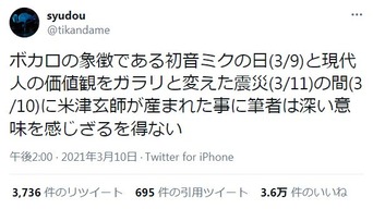 「ボカロの象徴である初音ミクの日(3/9)と現代人の価値観をガラリと変えた震災(3/11)の間(3/10)に米津玄師が産まれた事に筆者は深い意味を感じざるを得ない」