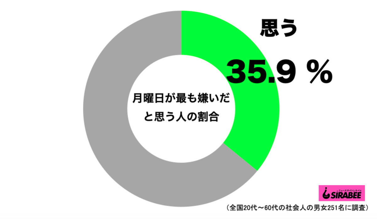週末が終わり、月曜日を迎えると憂鬱な気分になる人も多いのでは。しらべぇ編集部が行なった調査でも、月曜日はあまり人々から好まれていない曜日であることが明らかに…。■およそ3人に1人「月曜日が最も嫌い」しらべぇ編集部が全国の20代~60代の社会人の男女251名を対象に調査したところ、全体で35.9%が「月曜日が最も嫌い」と回答。性年代別で見てみると、30代女性が最も高く、半数以上が「月曜日が最も嫌い」と感じているようだ。■「休み明けの仕事ほどキツいものはない」日曜の夕方から深夜にかけて、「明日からまた仕事(学校)だ…」と憂鬱な気分になってしまう状態を指す「サザエさん症候群」という言葉も存在するほど。ちなみに、世界的には「ブルーマンデー症候群」と呼ばれており、月曜日が来ると憂鬱な気分になるのは世界共通のようだ。しらべぇ編集部が「月曜日が嫌い」だという20代男性に話を聞いたところ、「休み明けの仕事ほどキツいものはないですね…」との回答が。「日曜日のまま時間が止まればいいって思ったこともあります」とも話していた。■月曜日が好きな人は…一方、「月曜日が好き」と回答した20代女性は、月曜日が休みの仕事に就いているようで「待ちに待った休日という感じです」とのこと。「月曜日だと、役所関連の用事が処理しやすく、外出した際に空いているので得した気分になります」と話す。また20代主婦からは「月曜日が好きだった」との意見も。「子供が生まれ、初めての育児で本当に大変だった頃、仕事に復帰して、通勤用のパンプスを履いたとき、久しぶりに自分の時間ができた気がして、感慨深い気持ちになりました」とし、「子供は世界で一番大切な存在ですが、仕事をしている時間が唯一の自分の時間のような感覚もあり、『月曜日が来るのが楽しみ』だった時期もあります」と語ってくれた。月曜日が好きな人からは、「週刊少年ジャンプの発売日だから月曜日が好き」といった声も。いくら足掻いても、月曜日は勝手にやってくるもの。自分なりの月曜日の楽しみ方を見つけるのがいいのかもしれない。2021/07/12 04:30 しらべえ