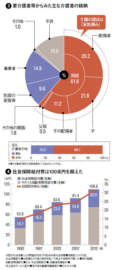 図4にあるとおり、社会保障給付費は100兆円を超え、さらに増え続けることが見込まれている。「対国民所得費」は2012年の時点で30.9%。これから老後を迎える世代において、これまでのような「手厚い介護」を受けることは現実的ではない。個人としての備えと覚悟が必要になる。