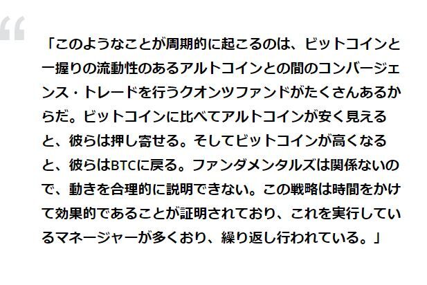 アジア最大級のDeFiに特化したファンドであるスパルタン・グループのマネージングパートナーであるコルビン・コー氏は、大規模なクオンツファンドは、ビットコインと主要なアルトコインの間のコンバージェンストレードを行っていると述べている。