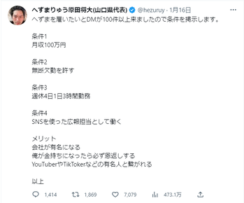 「条件1 月収100万円 条件2 無断欠勤を許す 条件3 週休4日1日3時間勤務 条件4 SNSを使った広報担当として働く」と要求。さらに「メリット」として、「会社が有名になる 俺が金持ちになったら必ず恩返しする YouTuberやTikTokerなどの有名人と繋がれる 以上」と続けた。