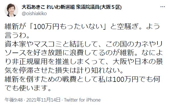 維新を倒すための戦費として私は100万円でも何でも使います。