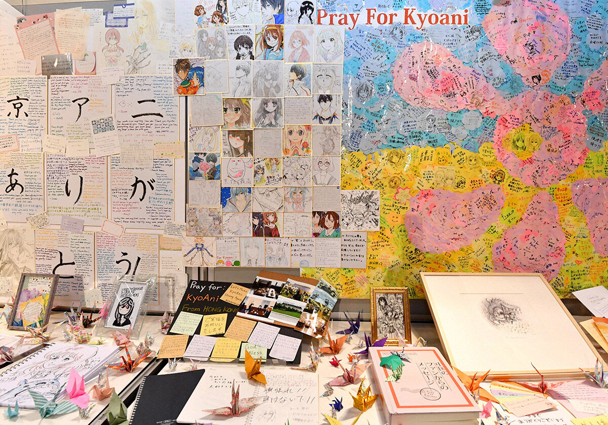 京都アニメーションの犠牲者を追悼する式にあわせて展示されたイラストやメッセージ(写真:毎日新聞社/アフロ)