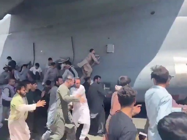 離陸直前の輸送機にしがみつく若者たち