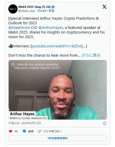 2025年8月25日〜26日にかけて開催される「WebX 2025」に、暗号資産デリバティブ取引所BitMEXの共同創業者であり、有名トレーダーとしても人気を博すアーサー・ヘイズ氏が登壇する。