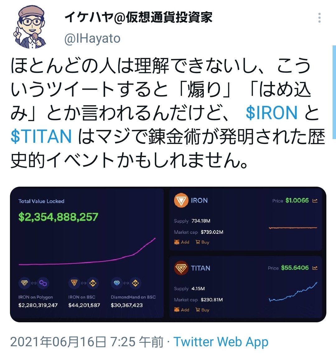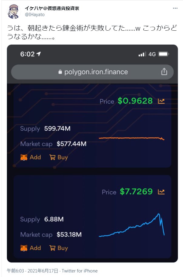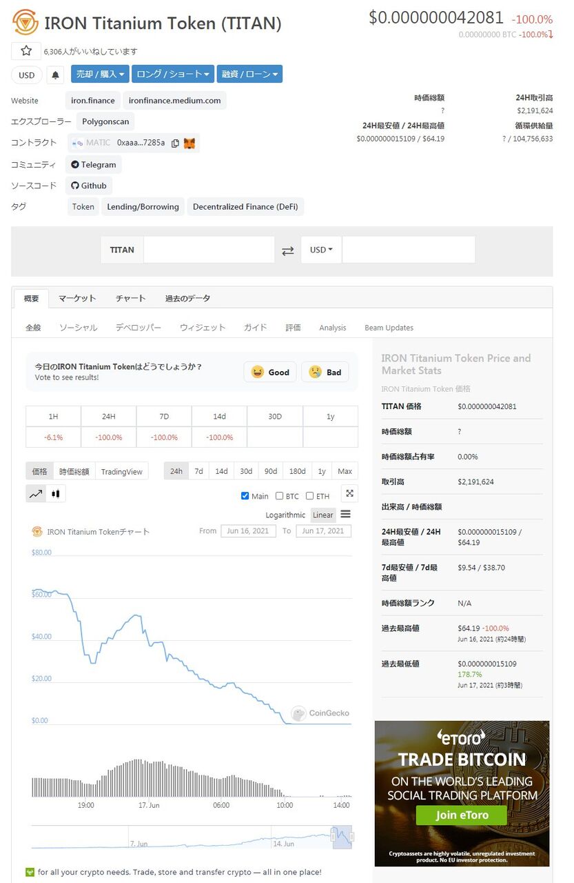 イケハヤさんが「歴史的イベントの錬金術が発明された」と煽ってたTITANが大暴落してこの24時間で12億分の1の値段になりました。
