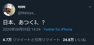 日本の暑さに悲鳴を上げているのは、日本でカレーを作っているインド人のマツヤ(Matsya)さん。彼は日本語は上手ではないものの、頑張って日本語で日本の暑さを伝えようとしている。以下は、マツヤさんのコメントである。