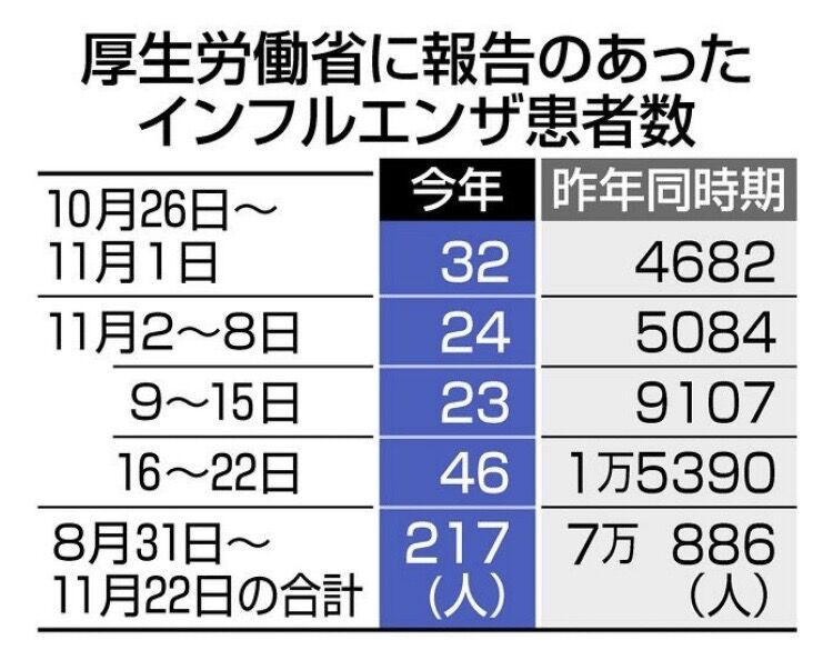 インフルエンザ患者激減 新型コロナとの同時流行気配なし?「ウイルス干渉」の可能性も8月31日~11月22日までの集計去年は7万886人今年は217人