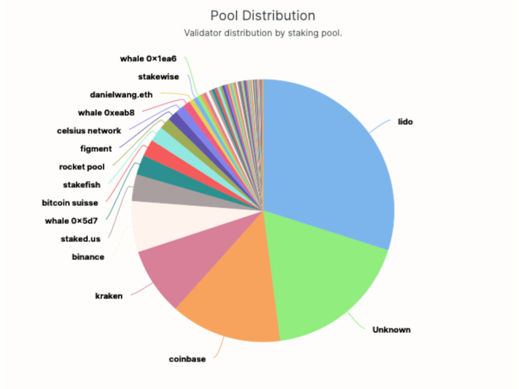 Mergeからまもなく、注目を集めたツイートがある。ノーシス・チェーン(Gnosis Chain)の創業者マーティン・コッペルマン(Martin Köppelman)氏が、イーサリアムの最初の1000のPoSブロックのうち420が、わずか2つの組織によって提案されたものだったことを指摘したものだ。その2つの組織とは、ステーキングプールのリド(Lido)と、アメリカに拠点を置く暗号資産取引所コインベースである。
