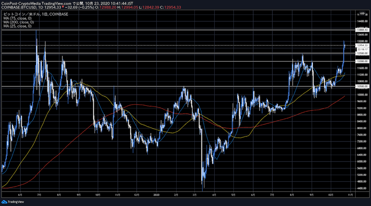 ビットコイン(BTC)価格は、前日比+0.48%の135.2万円(12,395ドル)と高値圏を推移している。