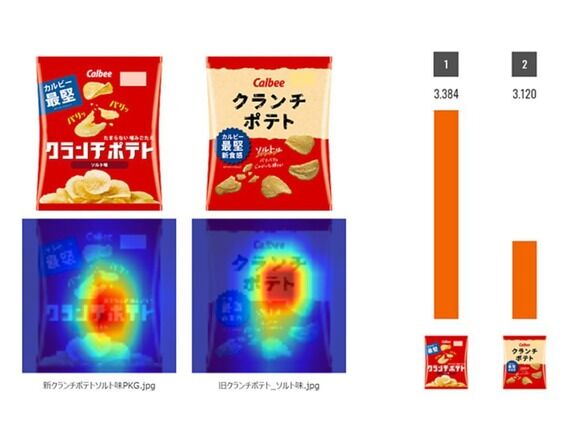 カルビー、ネスレ日本、森永乳業など、日本を代表する食品メーカー各社が導入しはじめているAIツールがある。マーケティングリサーチとパッケージデザインを展開するプラグが2年前にリリースした「パッケージデザインAI」だ。カルビーでは、「とうもりこ」「えだまりこ」に続いて、同社の“最堅”ポテトチップス「クランチポテト」のリニューアルでもパッケージデザインAIを活用したことを2020年9月に発表していたが、リニューアル前のデータと比べ、何と売上が1.3倍に増えたという。パッケージデザインAIとは、画像をアップするだけでデザイン評価をAIが予測するウェブサービスだ。主なアウトプットは好意度予測スコア、ヒートマップ、イメージワード、好意度のばらつきの4つ。「好意度予測スコア」は、1~5の数値でデザインごとのスコアを予測できる。最大10点の画像のスコア比較できるほか、性別や年代別にスコアを提示することも可能だ。「ヒートマップ」は、デザインのどこが好意度と結びついたかを可視化できる。これによって、デザイン修正の指針を得られるという。「イメージワード」は、デザインごとにどんなイメージを持たれるのかを予測する。かわいい、優しい、季節感があるなど、パッケージデザイン評価で頻出する19種類のキーワードが設定されている(食品以外では18種類)。「好意度のばらつき」では、万人うけするか、特定の層に支持されるかを測れる。「AIはよくブラックボックスだと言われるが、パッケージデザインAIはこのデザインの好意度がなぜ高いのかなど、デザイン評価の理由まで紐解ける設計になっている。AIの判定に従うというより、デザイン開発における試行錯誤や気づきの量を増やすことで、自問自答や議論が深まりデザインが正解に導かれていく、そのような使われ方をしている」(小川氏)実は、このような活用方法を生み出しているのは、先行導入したユーザー企業なのだそう。冒頭に紹介したポテトチップス「クランチポテト」の売上が1.3倍増(※)になったカルビーはその好例だ。「最堅というコンセプトや美味しさを伝え切れていない」という仮説のもと、パッケージデザインAIを駆使してリニューアルし、発売前に好意度予測スコアを大きく引き上げることに成功したのだ。(※インテージSRI調べ)小川氏は、「この商品のパッケージでは、バリバリという食感や堅さを伝えたいが、従来は商品名に帯をつけて色を変えていたため、どうしてもそこに目が行ってしまい、シズル感を伝えきれていなかったと考える」と説明し、このように話した。「デザインと調査をずっとやってきた経験から、AIの判定結果をヒントに自問自答しながらデザインをブラッシュアップしていけば、必ずいいデザインができると思っていたが、実際に好意度予測スコアも改善でき、パッケージのリニューアル後の推定販売規模が135%に、店頭率も上がったという成果につながり、大変嬉しく思っている」(小川氏)▽ 記事内容を一部引用しました。全文はソースでご覧下さい