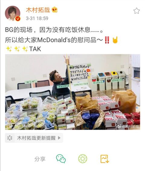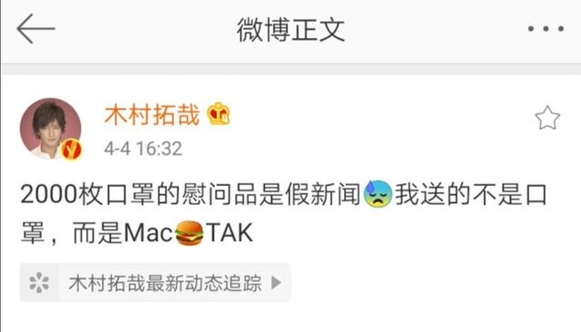 木村はこうしたネットニュースや、自身への否定的なコメントを目にしたのか、4月4日にWeiboを更新。「偽のニュース」「マスクではなく、私が送ったのはMcDonald’s(マクドナルド)」といった意味になる文章を中国語でアップした。木村は今年からマクドナルドのCMに出演しており、3月31日のWeiboでも、同社の商品が並べられ、「木村拓哉様よりマクドナルドの差し入れをいただきました」と紹介されている場所で写真を撮った1コマも載せていた。