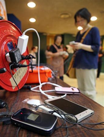 町内の大半が停電している厚真町の避難所では、スマートフォンや携帯電話の充電サービスが行われている=7日午後、北海道厚真町(桐原正道撮影)
