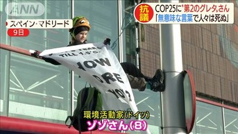 ドイツの環境活動家・ゾゾさん、8歳。スペインの首都マドリードの街灯に上って抗議活動です。最後は警察に強制的に下ろされましたが、地球温暖化に警鐘を鳴らす姿勢はアピールできたようです。