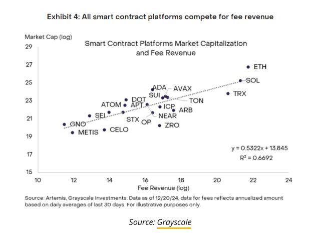 グレースケールは、イーサリアム(ETH)、ソラナ(SOL)、アバランチ(AVAX)、スイ(SUI)などのスマートコントラクトプラットフォームが「デジタル資産業界で最も競争の激しい市場セグメントかもしれない」と述べている。