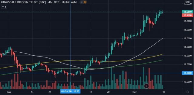 10月1日に、GBTCは11ドルで取引されていたが、11月13日時点では、17.96ドルに値上がりしている。