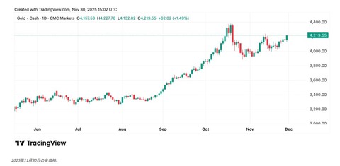 先週、米国の株式、暗号資産、貴金属は揃って堅実な上昇を見せました。11月30日(日)現在、金の1オンスは$4,219.55で取引されており、過去24時間で1.37%の上昇を示しています。