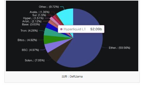 Hyperliquidは比較的新しいブロックチェーンだが、「DefiLlama」のデータによればDeFi(分散型金融)で運用のためにロックされた暗号資産(仮想通貨)の総価値「TVL(Total Value Locked)」は、全てのブロックチェーンの中で8位である。