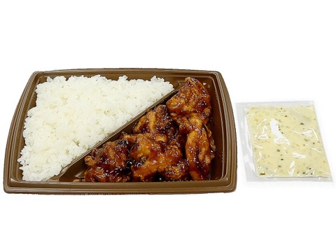 若年層に人気の「チキン南蛮弁当」で、鶏肉はしっとりと柔らかく仕上げているとのことです。熱量は916kcal。たんぱく質 38.2g、脂質 37.8g、炭水化物 106.3g(糖質:105.0g、食物繊維:1.3g)、食塩相当量 5g。