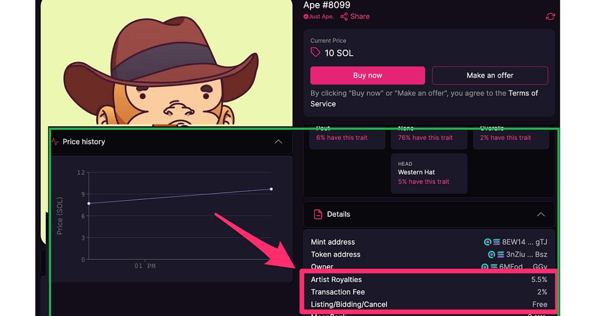 なお、Magic Edenの取引手数料は一律ですが、NFTコレクションの発行者に還元されるロイヤリティ手数料はまちまちです。以下のNFTは5.5%となっていますが、OpenSeaと同様にロイヤリティ手数料は任意で設定されるため、それぞれ購入前に確認する必要があります。