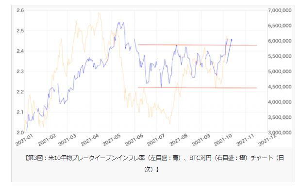 また、今週はBTCが5万ドルに乗せるタイミングで米国の期待インフレ率を示すブレイクイーブンインフレ率(BEI)が2.46%まで上昇しており、およそ4ヶ月続いたレンジを上方ブレイクしている(第3図)。足元では、サプライチェーンの逼迫、エネルギー価格の高騰、労働力不足、さらにはコロナ禍からの出戻り需要が物価上昇に圧力を掛けている懸念があり、こうしたこともBTC相場を支える一因となっているか。
