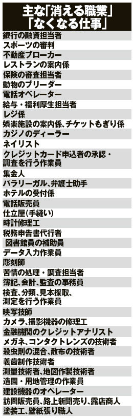右に載せたのは、そうした「消える、なくなる」可能性の高い主な仕事である。いずれもコンピューターに代わられる確率は90%以上という驚くべき数字が弾きだされている。