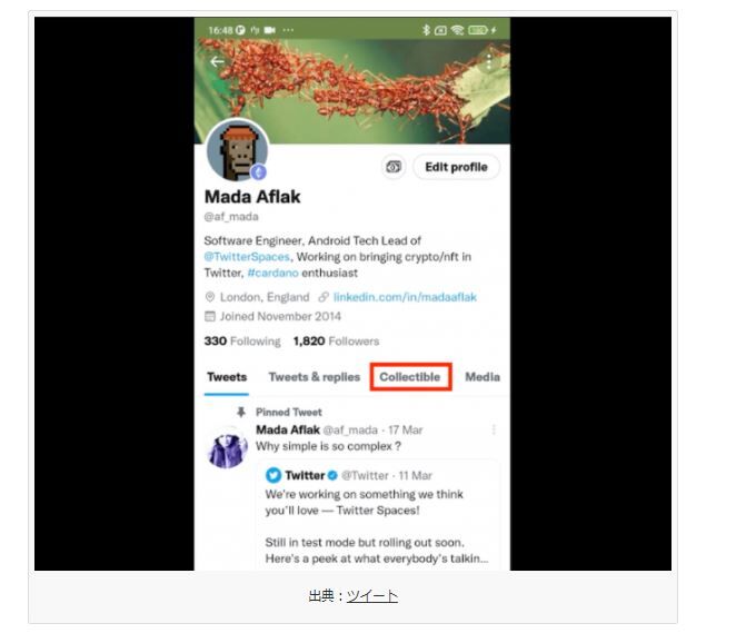 また、「Tweets&replies(ツイートと返信)」と「Media(メディア)」という項目の間に「Collectible」が追加されており、ここに他のNFTを表示できるようになる可能性もある。