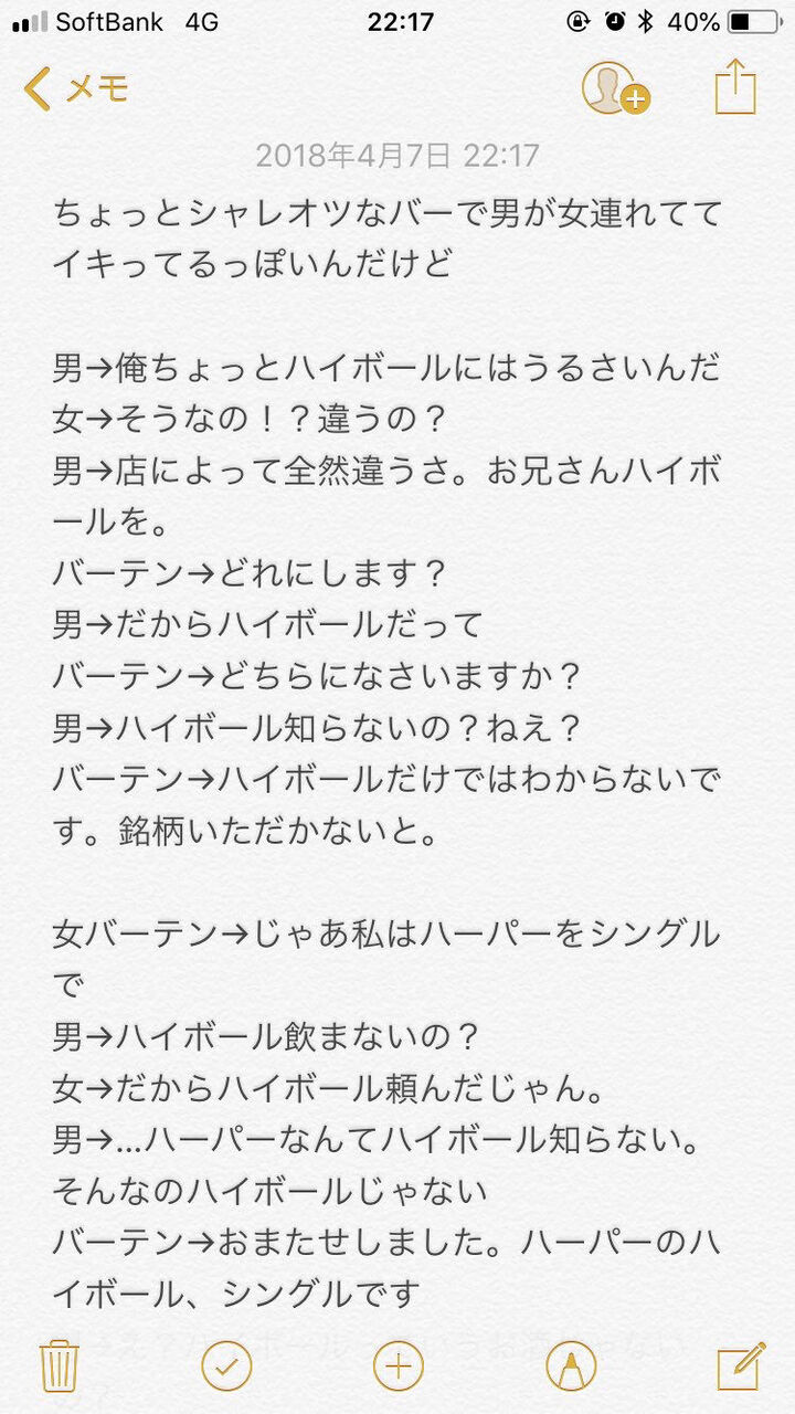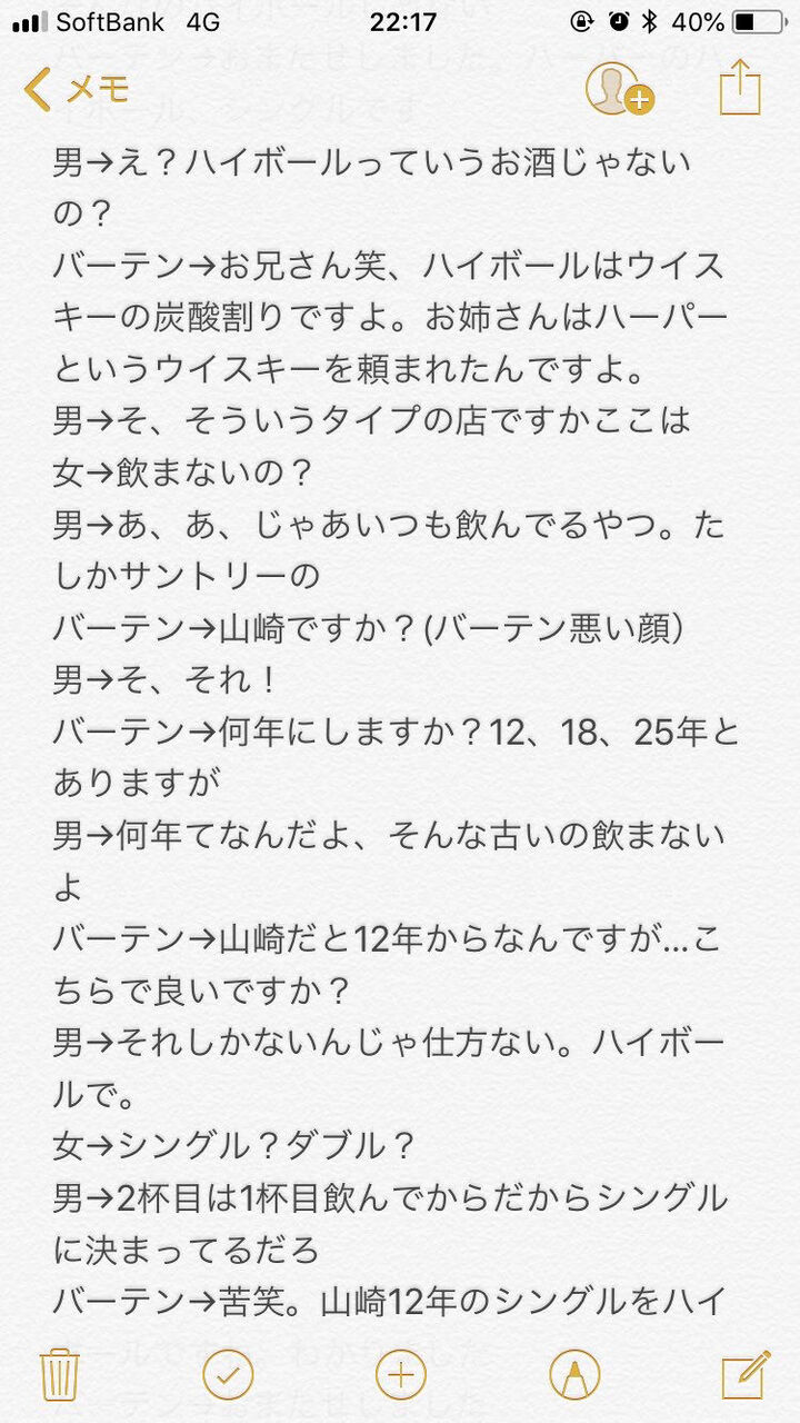そりゃもうハイボールをロックで、トワイスアップにして出してと説明しないとダメだお。