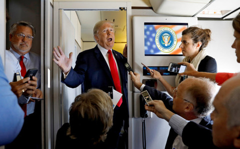 7日に米大統領専用機内で記者団と懇談するトランプ米大統領=ロイター