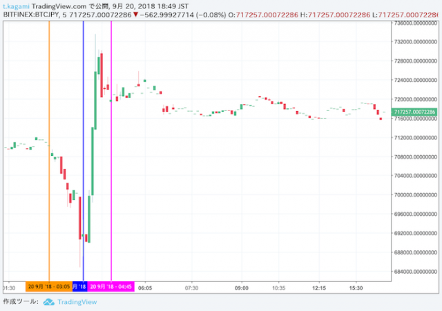 日本時間の深夜帯に発表された予期せぬハッキング報道により、下落に傾いたビットコイン(BTC)市場。bitFlyerでは71万円から68.8万円まで-3.8%ほど急落するなど狼狽売りが入ったが、海外取引所Bitfinexの強い買いが先行する形で、ショートカバーで$200(22,000円)ほど急騰。