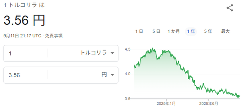 しょっちゅうネタっぽく言われるトルコリラスワポ生活だけれど、今年1年でのトルコリラの価値の値下がりは17%程。